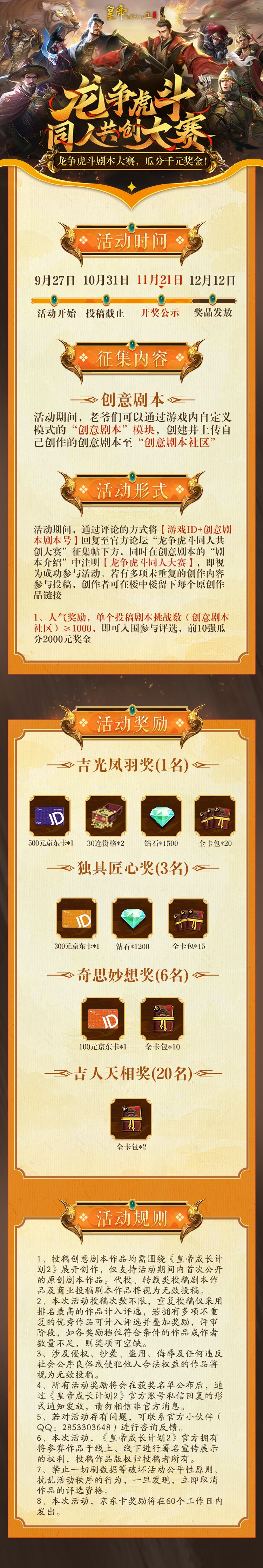 1、《皇帝成长计划2》官方将对各个官方游戏论坛评论区投稿作品进行审核,考虑剧本作品内容质量、点赞收藏综合数据等因素进行评定,评选出优胜作品获得【京东卡】【游戏道具】奖励。