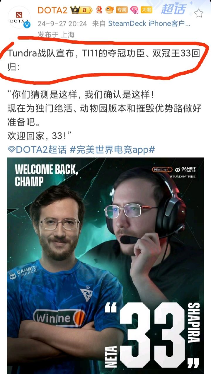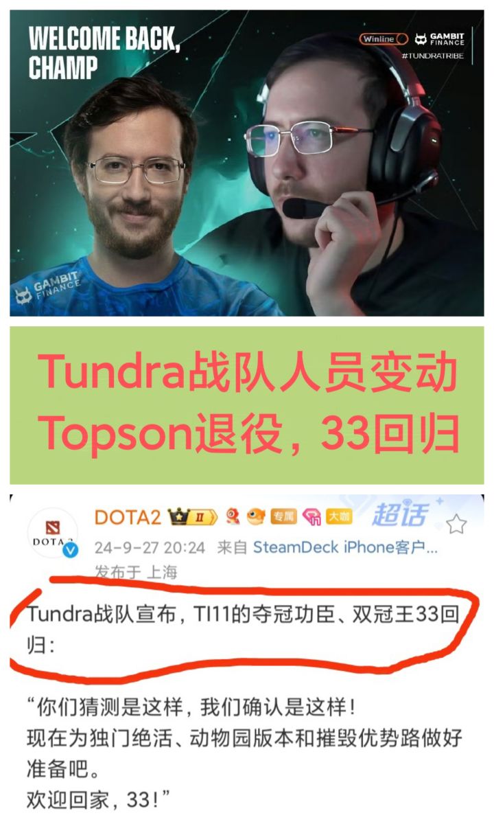 9/27号,根据DOTA2官方公布的消息,Tundra战队宣布双冠王“33”归队❗❗❗