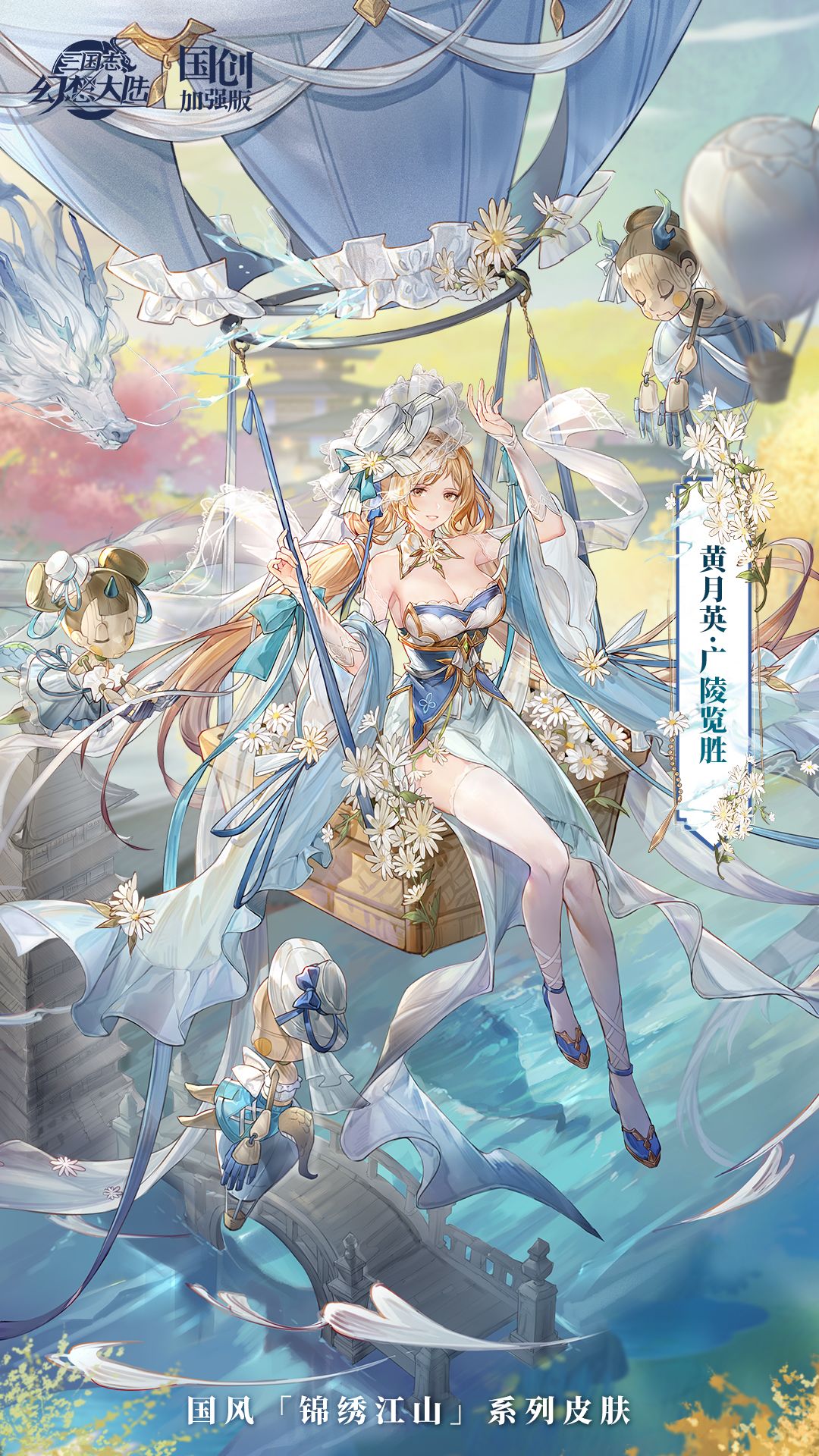 皮肤以世界非遗文化中的大运河为主要灵感。黄月英悠然端坐于雏菊环绕的热气球篮内,随风轻巡于大运河的千年波光之上,尽览历史与自然的交响曲。她身着淡蓝露肩长裙,发上轻搭着一顶同色系小礼帽,点点雏菊跃然衣间,仿佛是秋日留下的浪漫注脚。身旁的木偶,亦换上了淡蓝裙装,举手投足间,尽显对主人的可爱复制。