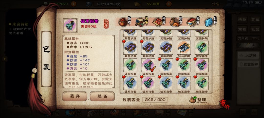 第四件,附加10真元第三件紫色全套,看了下可惜只有12.3穿。本身有一件13.5穿附加12臂力的拳套胚子