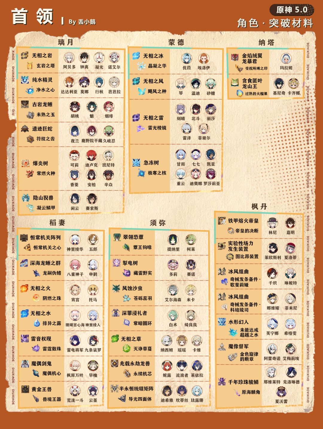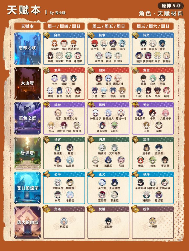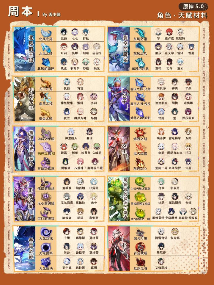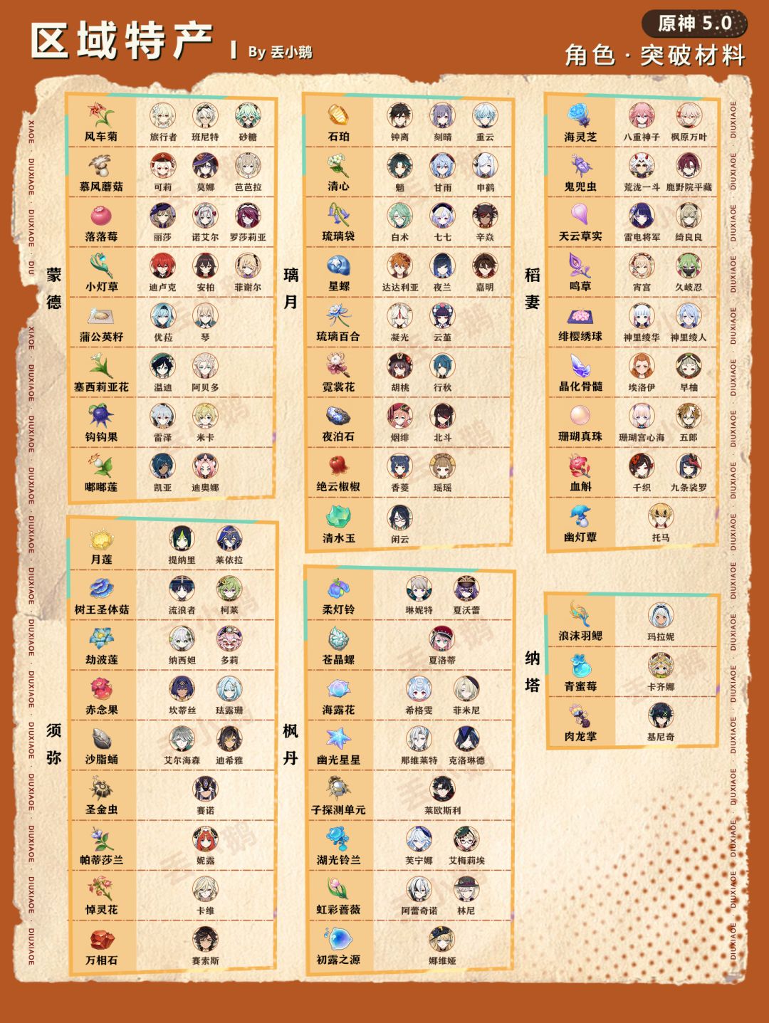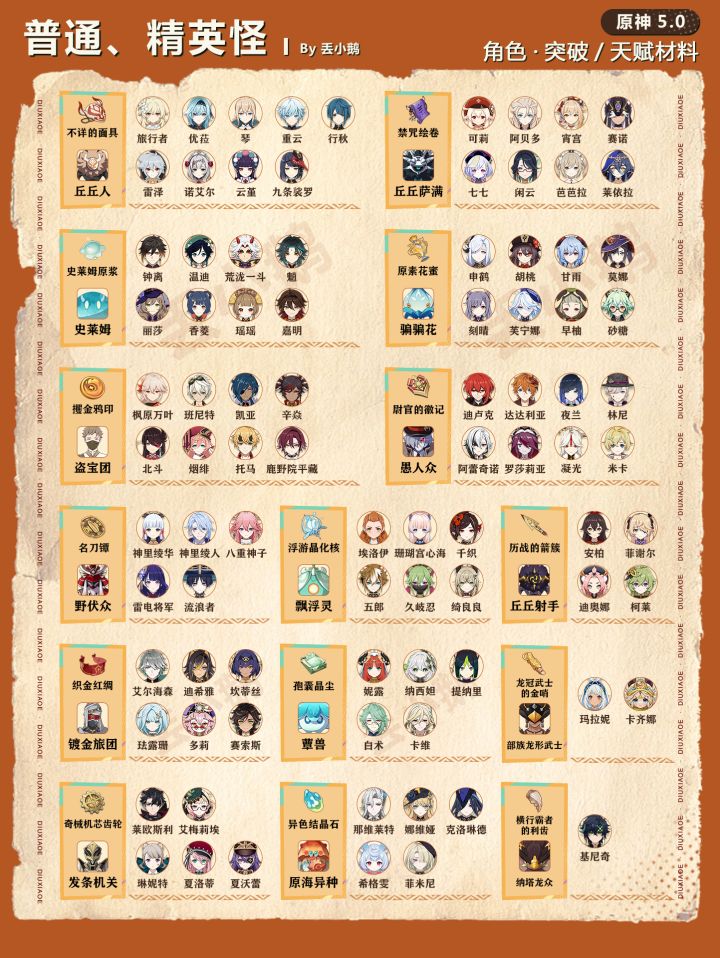 我是丢小鹅,为你带来【原神5.0】全角色突破/天赋材料一览表。