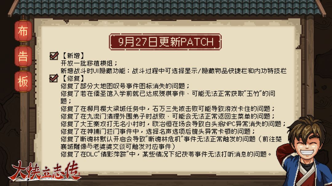 关于MOD冲突及BUG:最好开新档,读旧档的话可能会因为村长处于原版任务线中(比如小宝任务)导致接不到初始触发任务理论上这个MOD跟任何修改了角色池、事件、剧情、武学、物品...的MOD都存在冲突的可能...只要任意两个作者恰好使用了相同的编号就一定会冲突,这是不可能避免的...