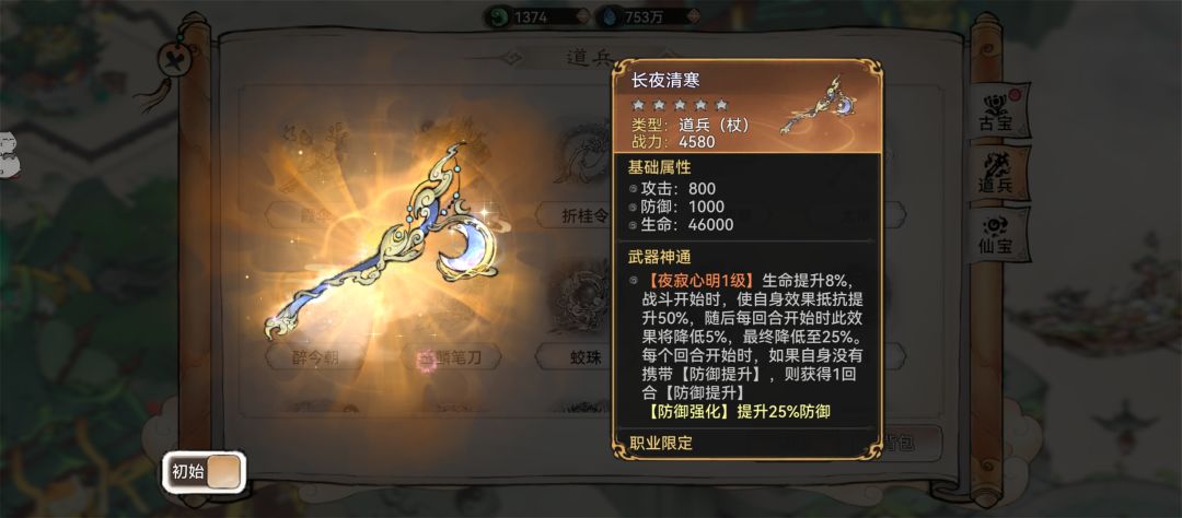 战斗开始时法宝蓄力增加20%,施展法宝神通后自身获得1回合【无敌]与【效果免疫]。
