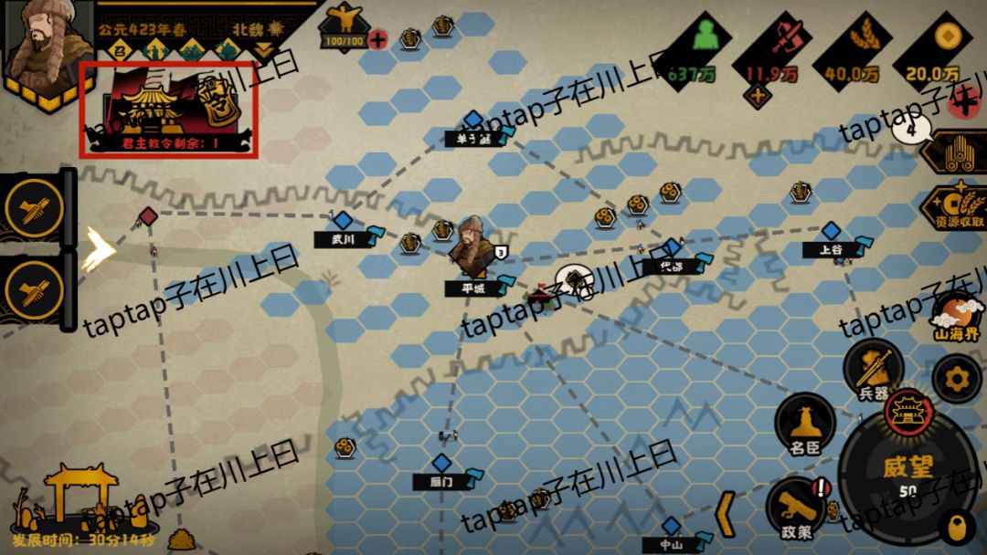 在进入太武立业、刘裕北伐、澄清南北的剧本后,您可以在大地图的左上角观察到代表君主敕令的标志。点击该标志,即可进入君主敕令界面。