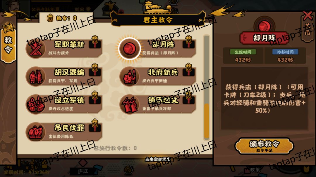 当然,在乱斗剧本中,敕令依旧有生效时间及冷却时间,大部分敕令的生效时间刚好为432秒,对应着游戏大地图一年的时间。因此,王上们需要根据实际情况,审慎选择合适的敕令。