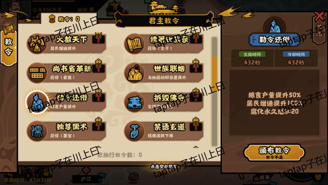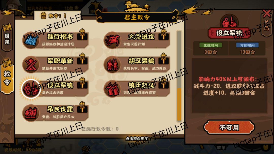 细心的王上们肯定已经注意到,敕令的右侧标有生效时间和冷却时间,以及红色字提示的前置要求。这正是因为部分敕令存在颁布条件,并且敕令具有一定的生效回合数,生效完毕后将进入冷却状态。因此,王上们需要根据实际情况,审慎选择合适的敕令。