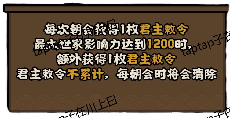 在剧情剧本中,每次朝会结束后,王上将获得1枚君主敕令。若在朝会中,影响力最大的世家的影响力达到1200点,王上将在朝会结束后额外获得1枚君主敕令。然而,王上需要注意的是,剧情剧本中的君主敕令若未及时使用,将会在下一次朝会开启时被清零。因此,在每次开启朝会之前,请务必检查是否已经使用了敕令。