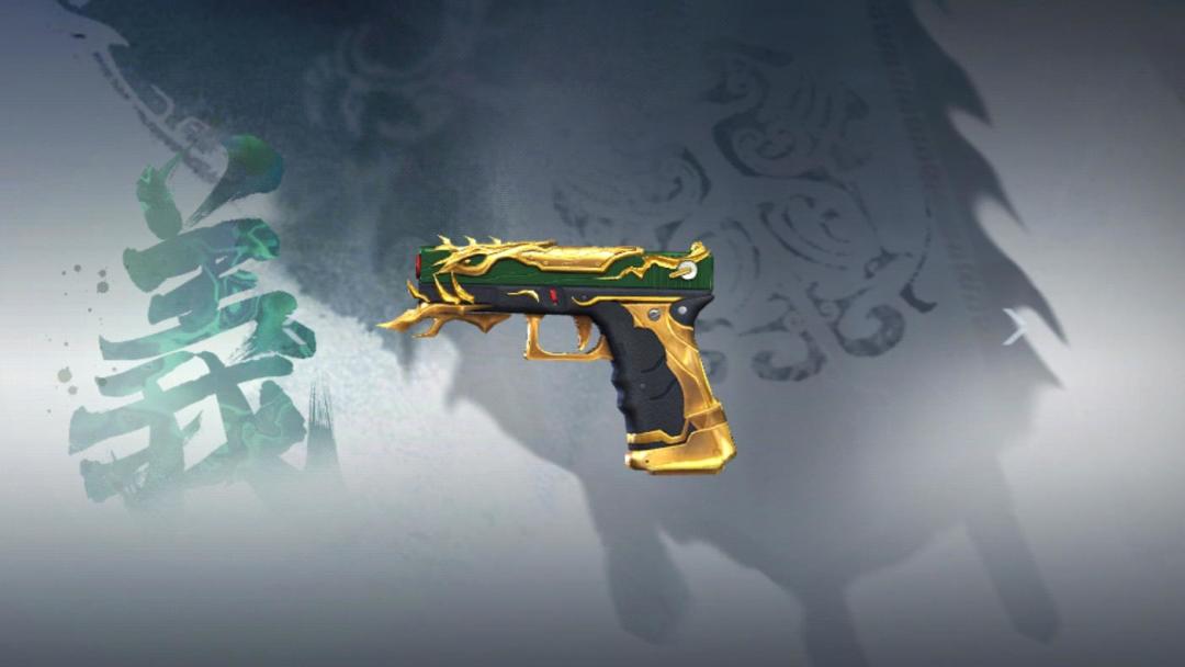 GlOCK18-武圣在原版GlOCK18的基础上增添了金色和绿色两种颜色。其中的主体配色绿色毫无疑问致敬了关公的经典绿衣衫。枪械上的金色部分纹理清晰,在枪首处雕刻出一条龙的模样。彰显了关公作为猛将的高贵地位以及不俗的实力。