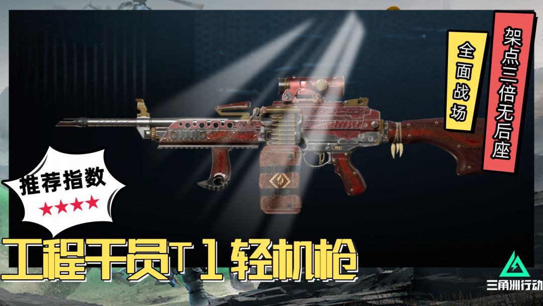 作为一把新手轻机枪,开场即可使用!同时意味着出场率一定是居高不下的!射速858发/分,是一把高速轻机枪!在“烽火地带”模式中常年在45000左右哈夫币,是最便宜的轻机枪,同时在“全面战场”模式中也是工程类干员最常用枪械之一!在当前环境下全距离稳定输出非常高,但由于后坐力较大,非常不容易上手!