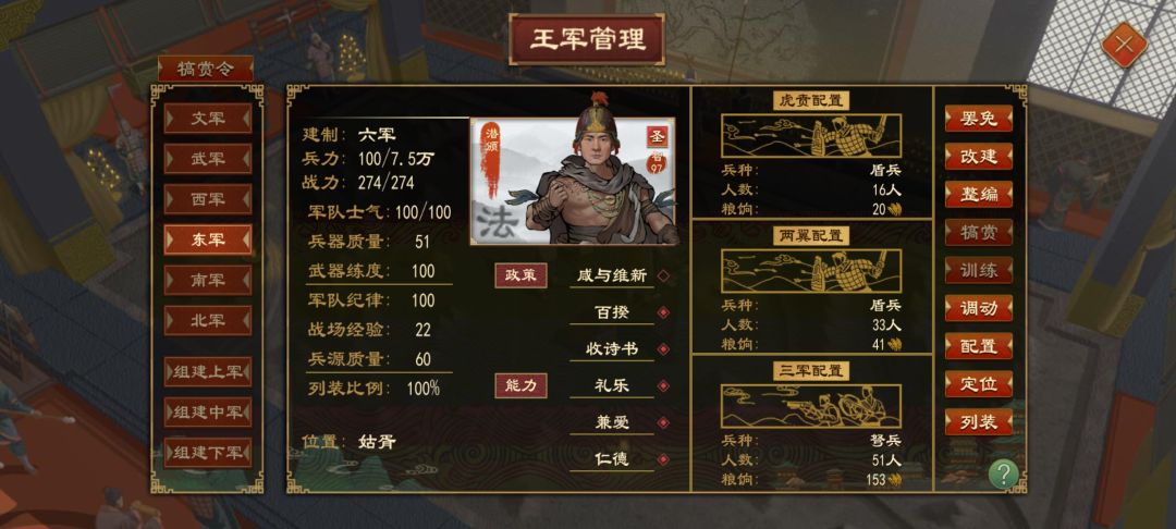 (兵种顺序按照,虎贲,两翼,三军排列,例如盾矛弩代表,虎贲为盾兵,两翼为矛兵,三军为弩兵)