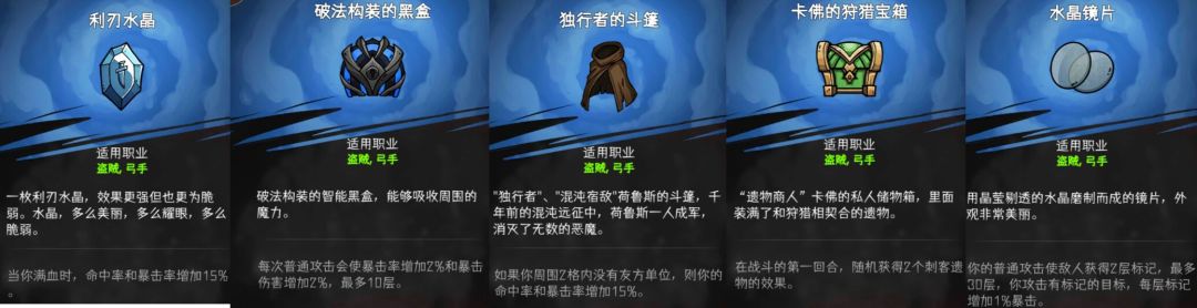 全是一些拿了就会有很不错效果的遗物,因为是辅助位,所以不会为了陷阱弓专门拿什么遗物的,这种加命暴的蓝色遗物还是可以拿一拿的