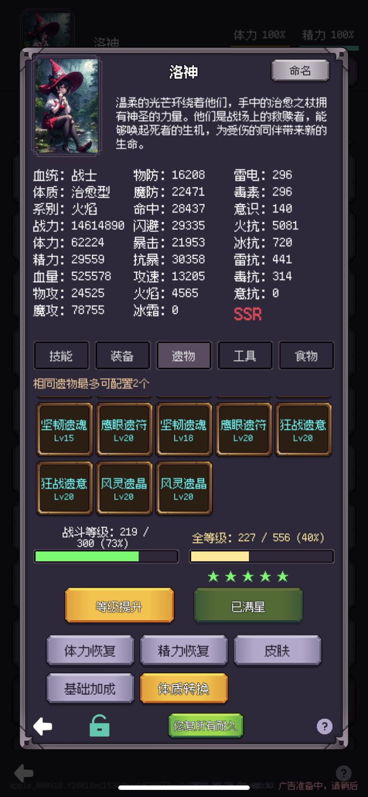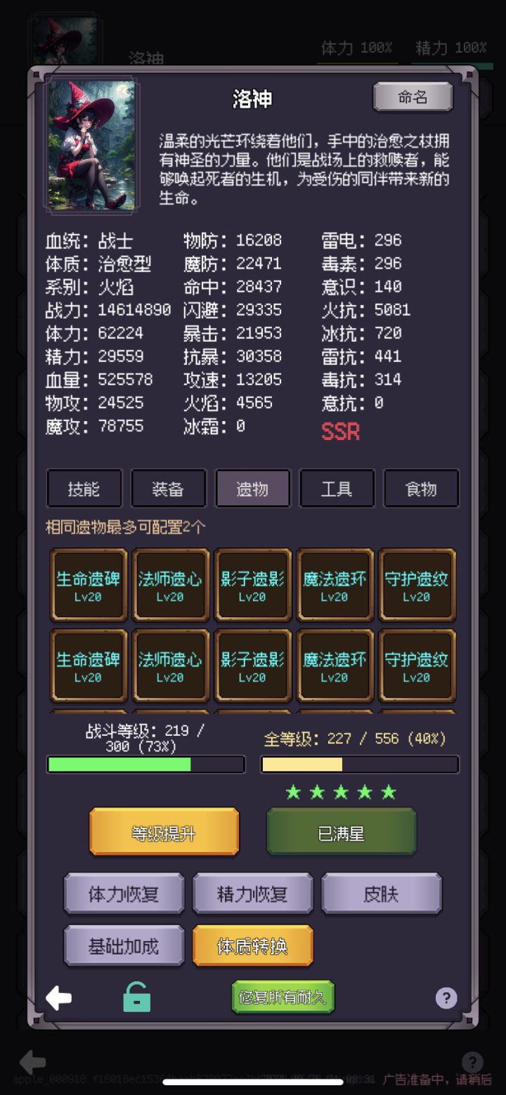 暂时开局主角治疗型比较好用 做完基础开局任务 可以选择买经验跟龙神精华升级到32级 开起第二个派遣位置 加速资源收集 。如果派遣英雄不够不要急,开局送的两种花还是要优先刷到主角吞噬的其中一个 不然后面开图很困难 。存3万龙晶买经验很重要! 到时候通关冒险地图就可以打黑暗了 一边打一边升级 可以到140级左右 。领地优先升级12个建筑物就好! 木。矿可以先每种开一个暂时够用 之后可以平均每种开2到3个。钓鱼主要作用是可以弄到钥匙 但是不多 没必要每种都开 之后晚些慢慢开满就好 ! # 遗物攻略么 遗物有20个位置 主角只要开满18个3万6龙晶 魔 物攻选择一个就好 一般龙晶不乱用 ,买完经验后升级 打黑暗打到打不动了 开满遗物的钱钱就够了