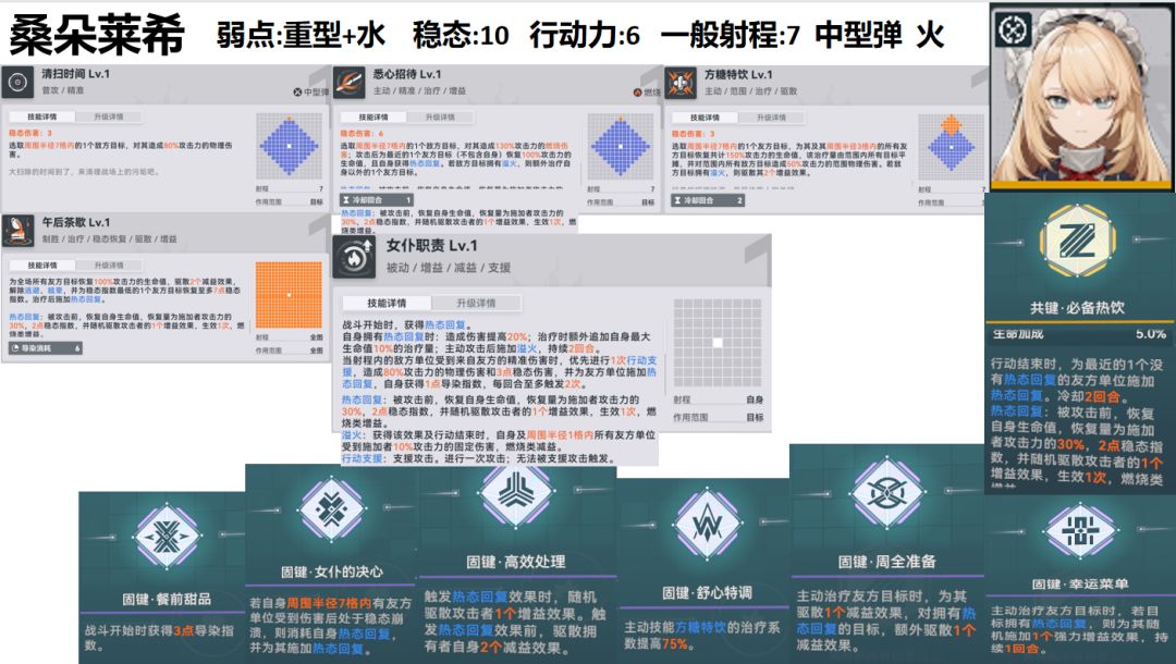 1. 可以给全员上热态回复增益(包括自己),顺序为:1.全员回血,回血量都等于桑朵莱希攻击力 2.全员上热态回复 3.恢复稳态最小的友方单位最多7点稳态 4.被动带来的追加10%生命全员回血。
