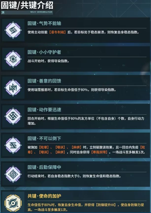 被动暖暖热源:行动后恢复两点导染,给范围内的队友加少量生命值,队友进行行动后随机给六格内的敌方施加雪崩,先手支援出现目前游戏内唯一的爆伤提升。