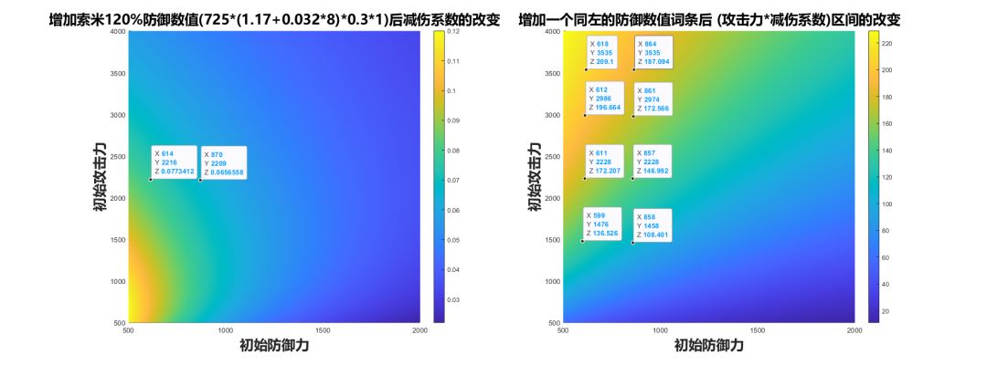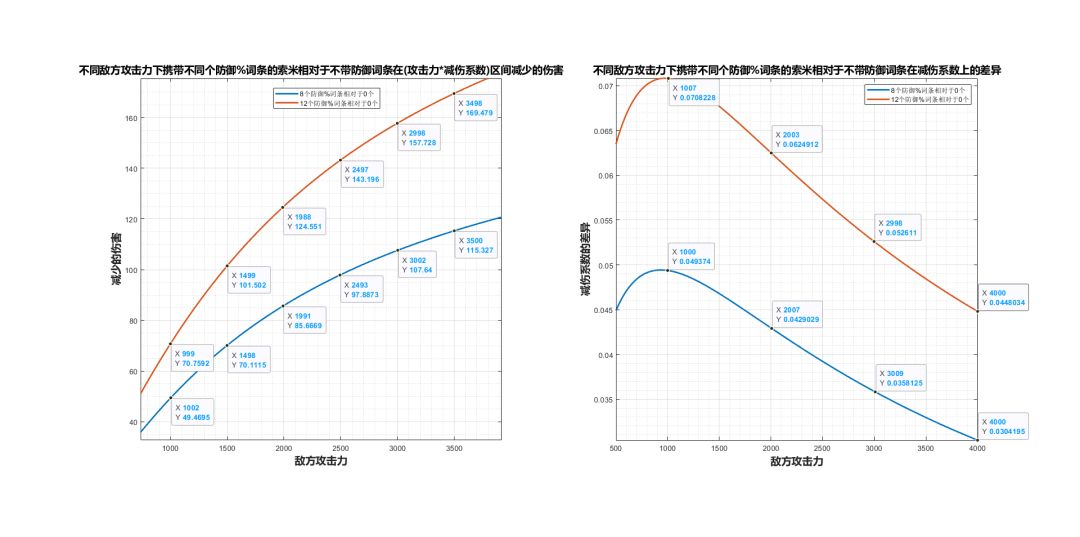 不同初始攻击与防御时,防御提升III能降低的伤害: