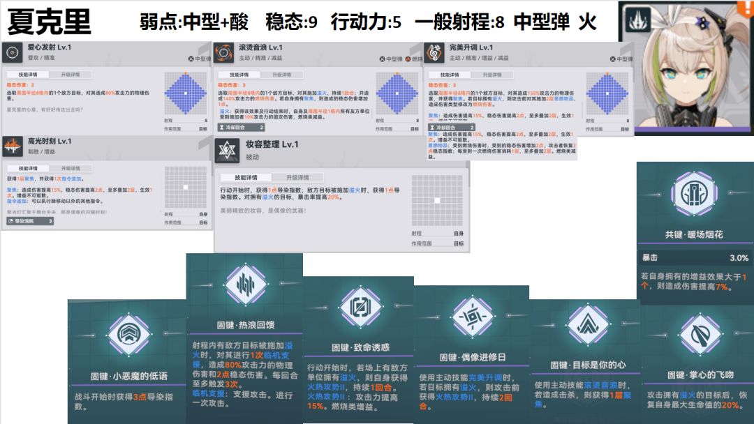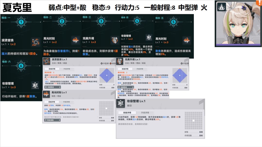 技能3(敌方有溢火时(暴击率+0.2):中型弹+火属性单体精准、攻击前施加两层易燃物品、攻击后获得一层聚焦):