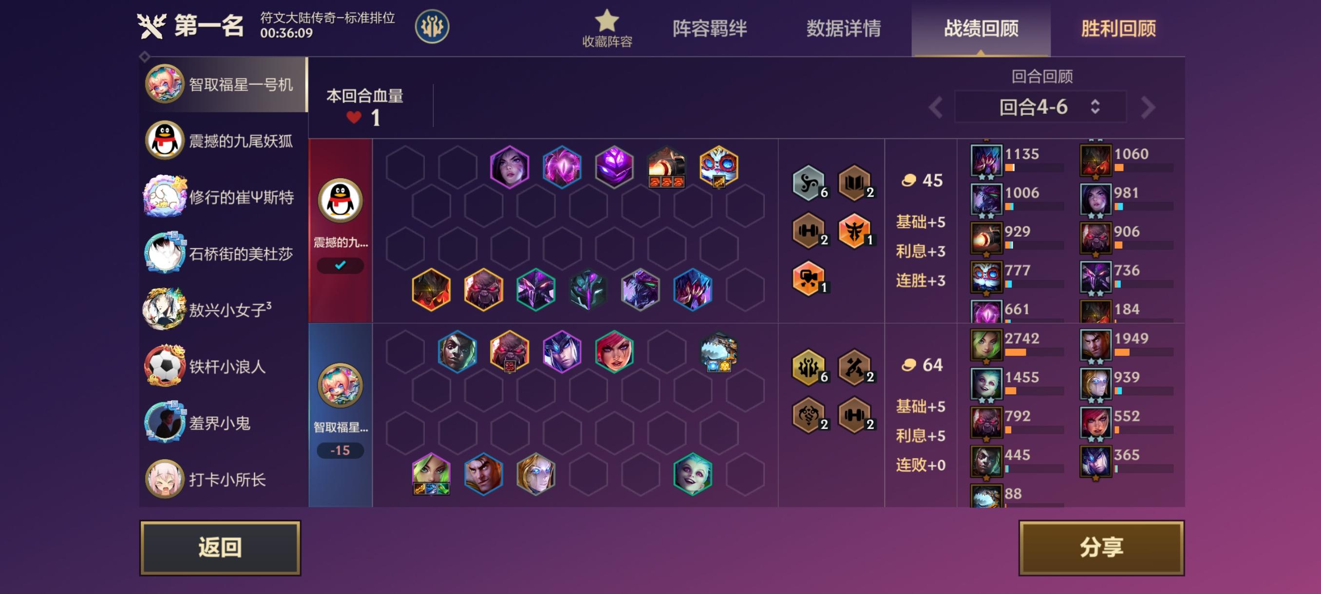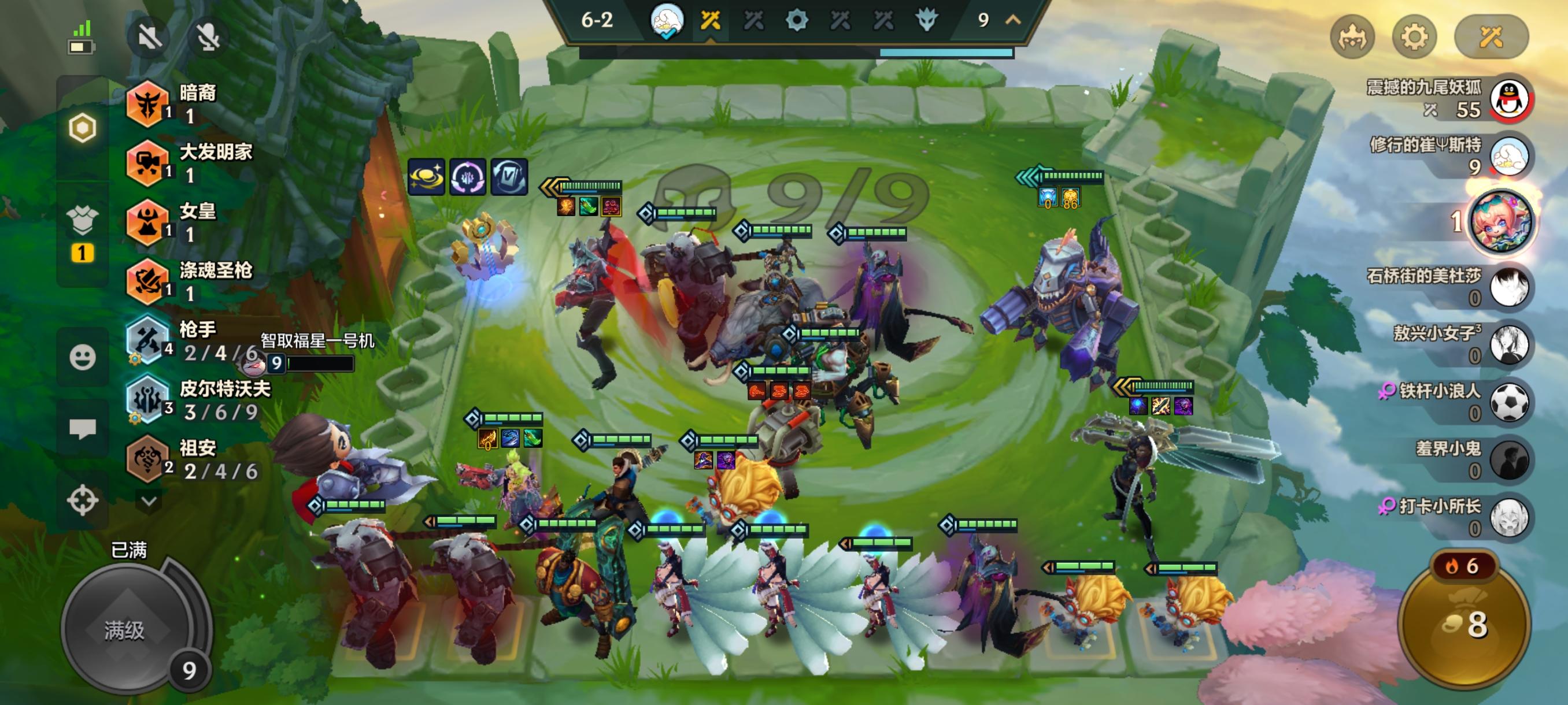 第二名当时也九级了,场上全是五费,怕没办法三星五费,先用妮蔻捏了个塞纳。后面五费被我们两互相拿完了,我试探的让他卖奎桑提,其他的我没三星的让给他,但是他不情愿。