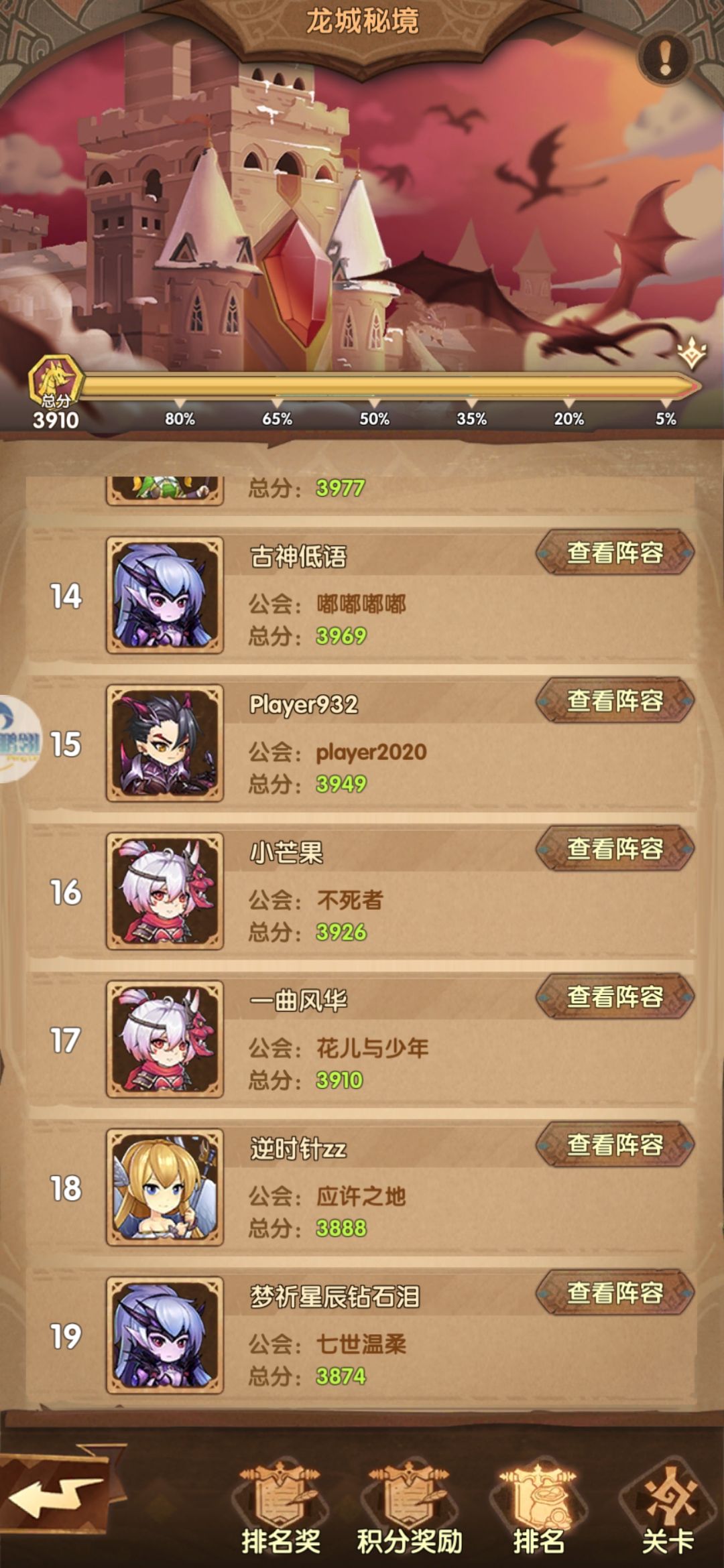 明天就要结束了。所以今天抽空打完。结果这龙城秘境排名奖励不划分了?。上次龙城宝藏起码还可以看到划分的排名奖励。这次???我id是一曲风华