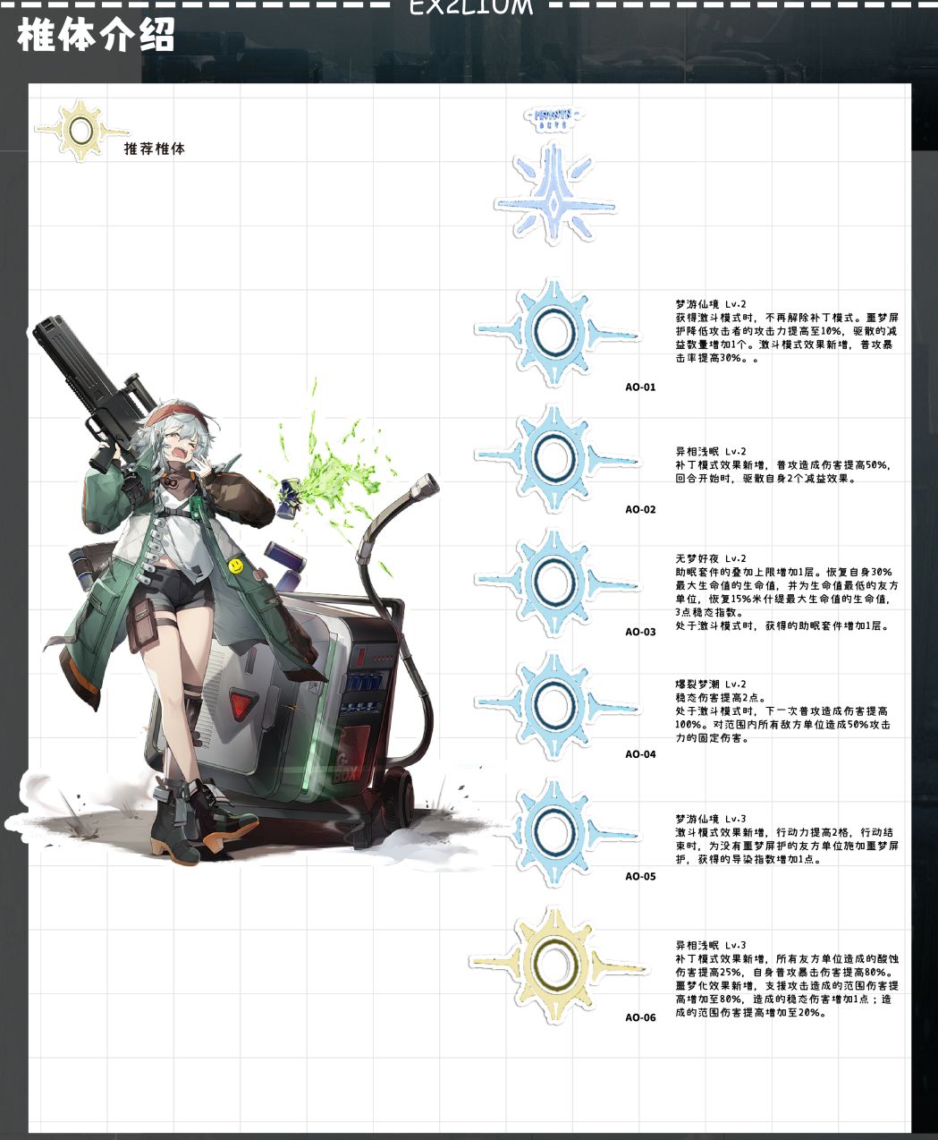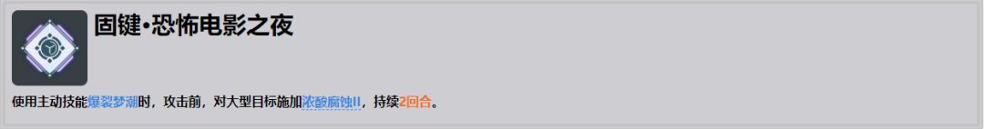 ●对boss站非常重要的固键,拥有该固键再配合上制胜技可以做到全程毒素环绕,也就是全程25%的全队酸蚀增伤,自身的铺地格能力配合上自身大多数的酸蚀伤害,大幅度的提高了该debuff的覆盖率。推荐度高。