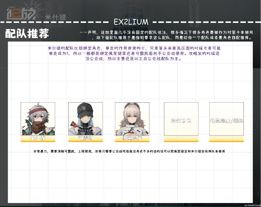 米什缇,佩里缇亚,可露凯,治疗角色,任意输出或者辅助:上限非常高的配队,在拥有大量满椎的情况下能达到非常高的输出上限,米什缇无论是破稳、驱散、上弱点都对该队伍有很大的提升。在只吃公会战低保且角色不多的情况下可以把米什缇和佩里缇亚拆成两队辅助可露凯。