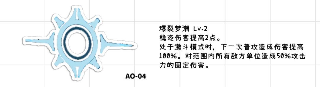 ●输出方面:130%倍率的aoe伤害算是米什缇推图的时候主要的输出手段也算是0椎时比较不错的输出技能,比较可惜的是范围比较小以及冷却时间较长。●辅助效果:该技能主要的功能就是在激斗模式下的铺地格,不过因为有固键快点打完好睡觉的存在,所以该技能算是可以用于补足地格的空档期,并且作为0椎不错的输出手段。同时需要注意的时爆裂梦潮是可以主动放置铺地格的范围的,而固键快点打完好睡觉做不到,算是两者铺地格的差异之处,但是由于现在核心内容是公会战,所以两者区别不大。●铺设地格作用:这里还是补充一下铺地格的作用吧(这里列出前提,就是敌方没有酸弱点),酸地格有一次的固定伤害,可以稍微弥补一下米什缇的输出,铺地格能够提供酸弱点,相当于一个独立的10%的增伤,对于包括可露凯佩里缇亚在内的输出角色来说都算是比较大的提升,附加酸弱点能提高破稳效率,同时酸地格能够提供比较稀有的稳态失衡Ⅰ,进一步提高破稳效率,所以酸地格带来的提升是非常大的。●激斗模式下还会给自身移动提升,在推图中能发挥一点作用,现阶段公会战用处不大。