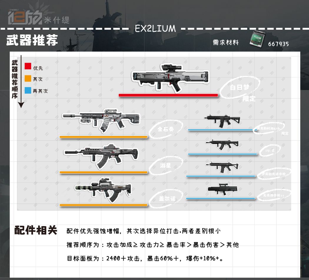 →其他●现在由于武器太多,所以统一说明,除女仆准则以外有什么金武器就选什么金武器,四星武器选择顺序为黑克勒科赫41、191式、罗宾逊先进步枪、无壳弹步枪11、97式,然后则是有什么用什么。