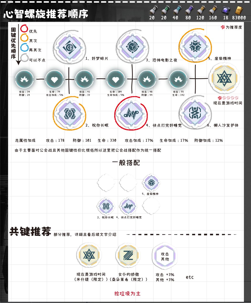 现在是游戏时间(米什缇(限定)):米什缇的共键几乎是为自身量身打造的,所以效果也非常好,但是因为米什缇的输出能力比较低,尤其是0椎,那么其实该固键对整个队伍带来的提升其实很小。女仆的骄傲(桑朵莱希(限定)):因为是辅助角色,所以可以佩戴一下桑朵莱希的共键来提高自己的辅助能力,还能稍微一下部分时间段的治疗或者是驱散。生存本能(玛绮朵(限定)):一图流不提出,因为这个比较特殊所以单独领出来,如果未来有需要抗伤或者高压环境的话,高共键对于米什缇也有一定作用。所有+3%攻击的共键