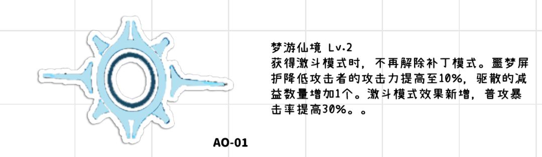 ●辅助能力:比较简单的描述,非常直接的范围增伤,以及范围支援伤害增加,在现在的可露凯环境下,米什缇带来的增伤效果对于可露凯的提升非常的小,但是米什缇的被动对于佩里提亚的提升则是非常的多,范围支援射击以及范围伤害的提升弥补了佩里缇亚buff少的问题,同时支援射击附酸伤,大幅度的增加了佩里缇亚的上限,无论是伤害还是破稳能力,该被动的效果让佩里缇亚达到了非常强力的水平,已经能作为了一个强力输出上场了,但是有前提,就是需要aoe队友,否则依旧没有发挥的空间,但是由于现在以公会战为主,所以佩里缇亚的提升是非常明显的,如果下次公会战血量压力比较大了,那么有可露凯的佩里缇亚带来的输出是非常可观的。●补丁模式:这里单独说一下补丁模式,现低压环境上,补丁模式的作用不明显,且0椎进入激斗模式会解除补丁模式,1椎之后则可以共存,2椎之后才开始有点作用,满椎则到达质变。