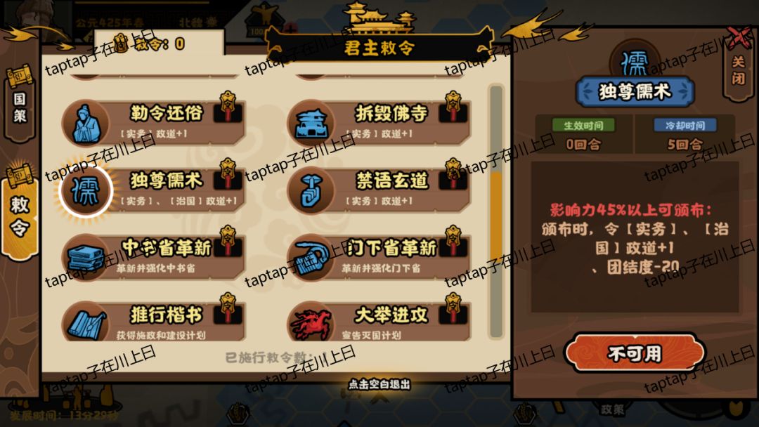开局建议可以适当点出一些名臣政策后,选择君主敕令中的【推行楷书】,然后召开朝会,前几回合的朝会,可以考虑察举阶段安排人手到尚书省,争取多接取施政计划,同时维持高团结度,最后便是点出一些民生、军事类政策,方便优先完成主目标。