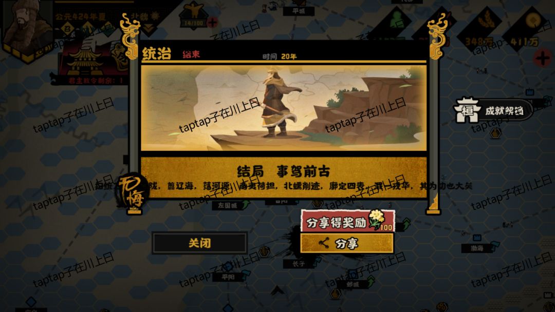 在普通难度以上,完成主要目标与次要目标,即可通过施行对应政策,同时达成高级结局与普通结局——事驾前古与总括戎荒