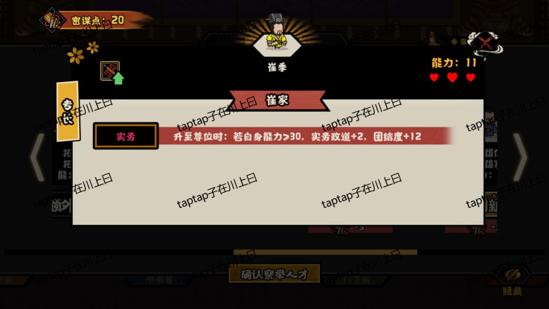 3.在人才察举阶段,也可以注意部分有【实务】政道或者专长的人才,利用这类人才也可以较容易达成【实务★5】的要求
