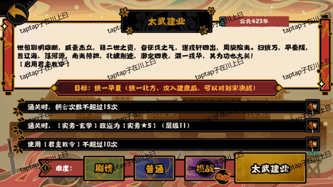 在太武建业剧本中,主要目标并不是难点,稍微有些难度的是次要目标中对于【政道】属性的把控,因而推荐玩家优先完成主要目标,然后在利用君主敕令与朝会达成【政道】属性要求。