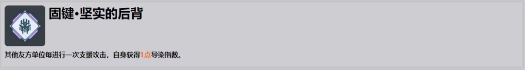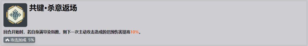 ●回合开始时满导染增加下次主动攻击造成的范围伤害。由于可露凯自身恢复导染速度非常的快尤其是带上固键·坚实的后背之后除了第一回合几乎能全程覆盖,且可露凯所有主动技能都是范围伤害,能够很轻松的吃到加伤性价比很高。●适合的其他角色:由于加伤是加范围伤害,且需要回合开始满导染,性价比最高的是洛塔,能够全程覆盖。之后再考虑能够吃满支援射击的佩里缇亚和杜莎妮,剩下的性价比都比较低,还可以选择的有不用制胜技的朝晖。