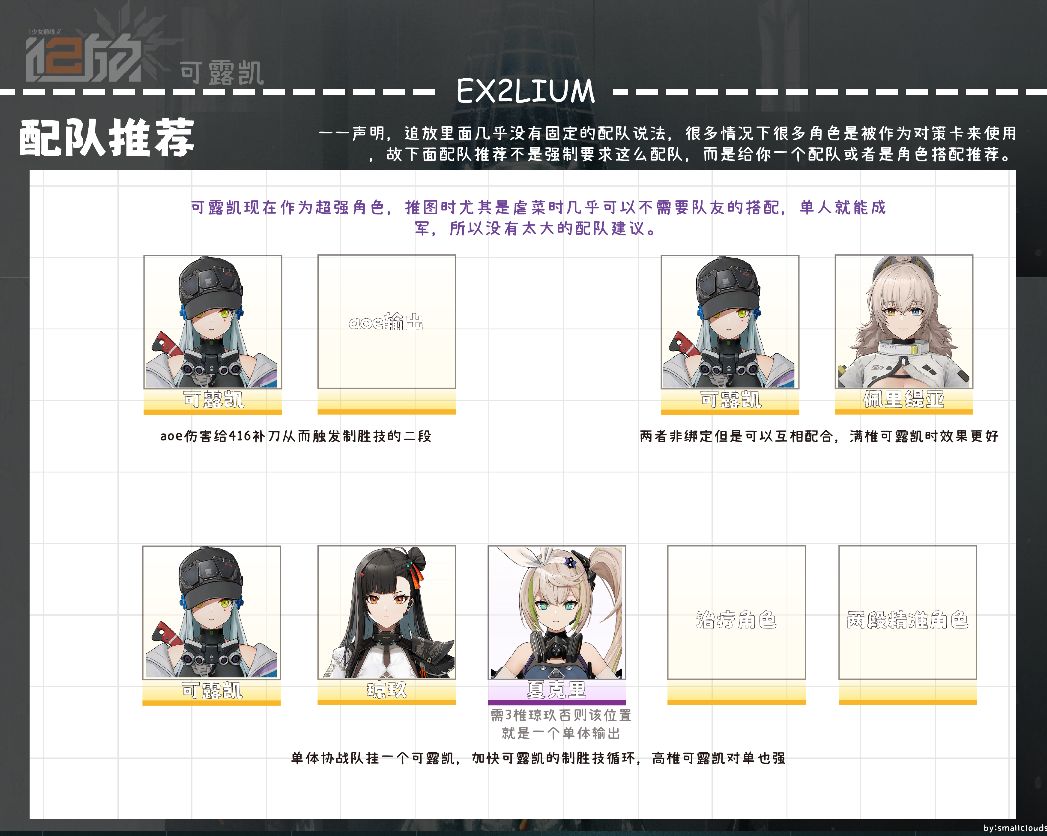 可露凯,aoe角色:配合aoe唯一的目的就是帮助可露凯压低血量,尤其是低椎的可露凯,面对有一定肉度的敌人的时候100%倍率没有辅助的情况下还是需要队友垫刀从而触发可露凯的第二段制胜技。可露凯,佩里缇亚:虽然可露凯可以配合佩里缇亚但不是绑定佩里缇亚,满椎可露凯能够有效的配合佩里缇亚来降低自身制胜技的冷却时间,同时低椎也能通过佩里缇亚来帮忙,也能够让佩里缇亚能够比较轻松的打满支援射击,算是不错的配合,但是实战中,大部分都是可露凯自己创完了或者创到比较远的地方导致佩里缇亚作用不太明显,所以有些配合但不是绑定。可露凯,琼玖,夏克里(配合三椎琼玖),治疗角色,两段精准攻击的单体角色(可以是莱娜也可以是黛烟等):一个比较理论的单体协战队配上可露凯,通过多次的支援射击来加快可露凯制胜技的冷却速度,在拥有满椎可露凯时可以稳定每回合制胜技。同样其实只是支援射击数量的问题,2椎之后支援射击的需求就没有那么大了,可以根据情况适当调整。