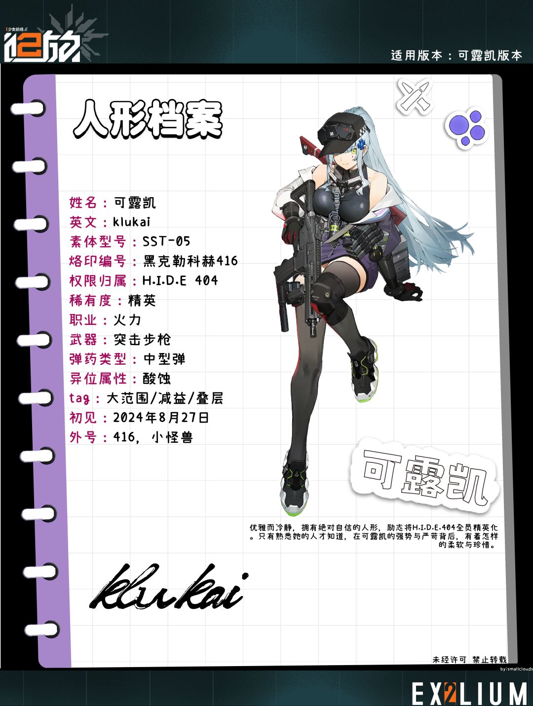 优雅而冷静,拥有绝对自信的人形,励志将H.I.D.E.404全员精英化。只有熟悉她的人才知道,在可露凯的强势与严苛背后,有着怎样的柔软与珍惜。