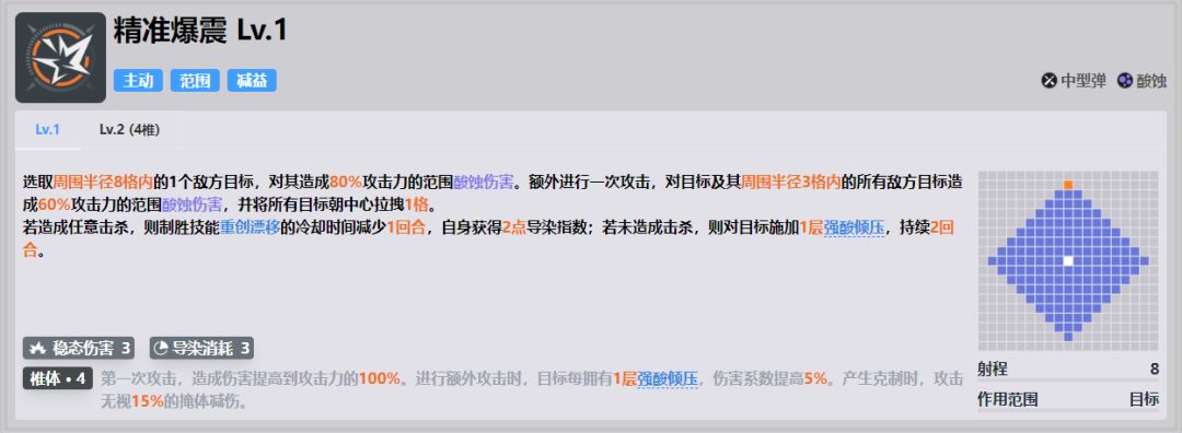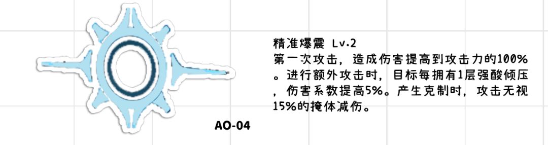 ●再拉满强酸倾压后,该技能的单体伤害倍率达到了235%,同时还有强酸倾压自己的180%倍率,在自身无法使用制胜技的回合,对单精准爆震依旧能打出非常可观的输出。●无视部分掩体减伤可以说是弥补了aoe角色的一个小缺陷。