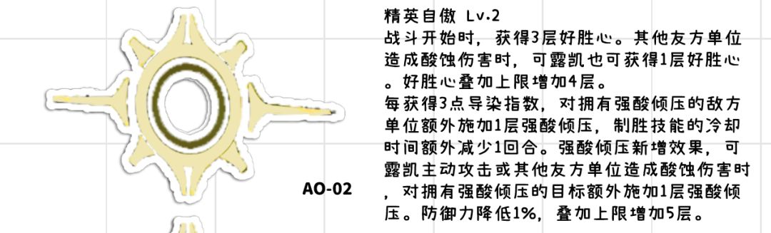 ●有点小作文啊,这里稍微总结一下就是加快了好胜心以及强酸倾压的叠以及上限,以及加快制胜技冷却,同时强酸倾压增加减防效果,叠满就是15%减防,是独立于防御降低的额外减防,高贵,也是增加了可露凯的buff以及对单能力还有就是推图中制胜技的释放,这一椎是关键的增加手感的椎体,同时让可露凯对单达到了一个很不错的水平,还有高贵的独一个的新减防机制,故此椎体性价比很高。