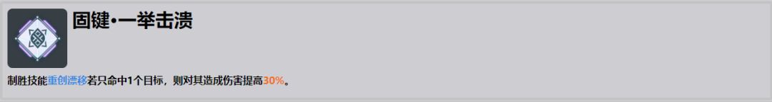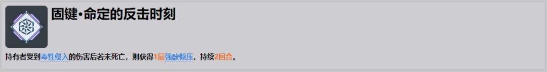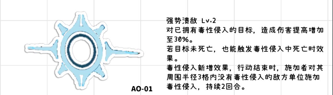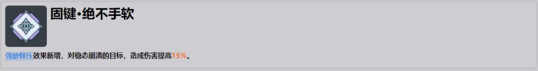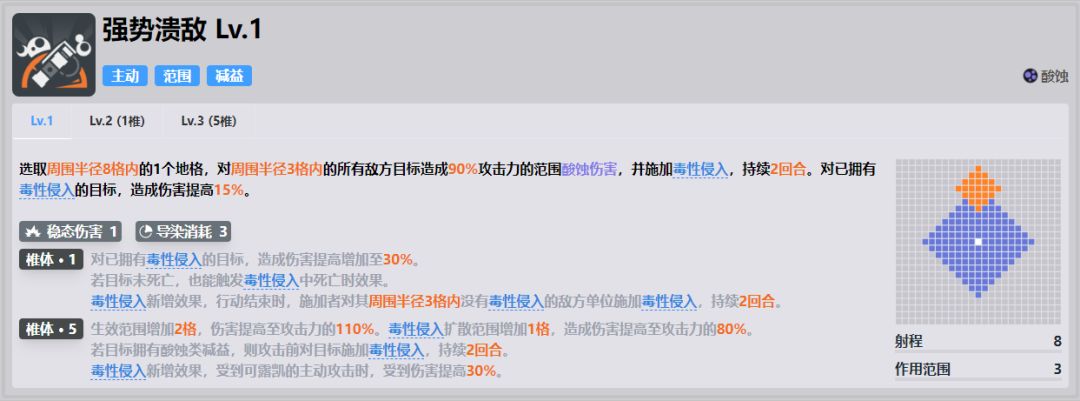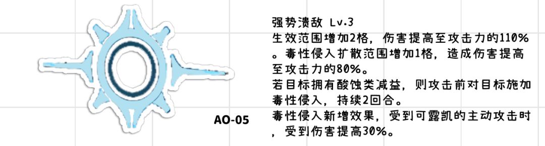 ●大幅度加强强势溃敌的伤害,直接能触发毒性 侵入,几乎就是常驻150倍率的aoe,同时对付多个敌人的时候能造成非常可观的aoe伤害,在推图中可以稍微减少制胜技的需求,光强势溃就能作为一个非常强力的aoe输出。