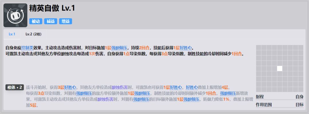 ●免疫控制类效果,能处理的事情很多,能避免很多机制,无论是一些boss带的控制还是pvp绛雨的伏击,让可露凯能够非常稳定的打出想要的输出。●在对于单体敌人的时候,可露凯的很多伤害都需要由强酸倾压来提供,甚至在高椎时还需要快速叠强酸倾压来降防,所以对单的时候需要稍微留意一下。●好胜心,不可驱散的常驻buff,朴实无华,注意好奇心叠层是按照主动技能命中的敌人数量来算的不是使用技能的次数,且 毒性 侵入这类的不会叠层,也就是在推图中怪数量多的话能做到一回合叠满好奇心,也就是几乎常驻40%的加伤,不过相对来说0椎对单的时候叠层数会比较慢。●回导染减制胜技cd的手段之一,不过由于现在酸蚀人形比较少同时可露凯制胜技的获得导染是减少不了制胜技cd的,所以一般来说主要还是靠固键以及小技能,且性价比都不错。核心是获得导染后制胜技减少cd,且能够回复导染的手段很多,所以不用太担心制胜技cd的问题以及小技能导染不够的问题,经常的满导染还容易触发自身共键的加伤,而且制胜技的强度已经在前文中提到过了。