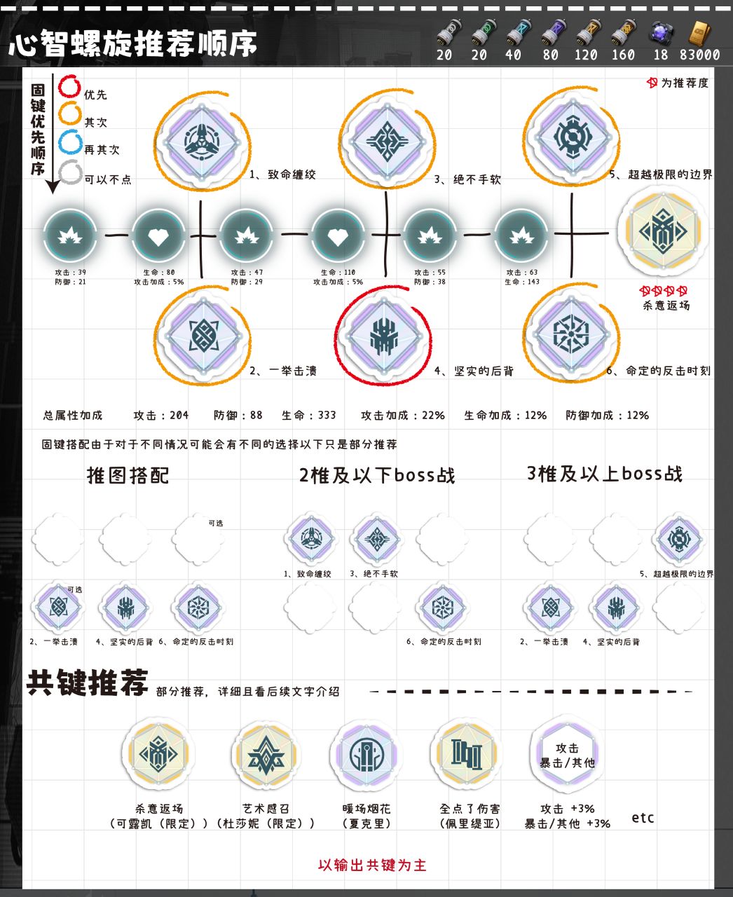 杀意返场(可露凯(限定)):可露凯自身的共键非常契合,因为自身获得导染非常方便所以除了第一回合几乎就是全程覆盖。艺术感召(杜莎妮(限定)):可露凯基础6格的行动力算是比较高的了,同时艺术感召的加成是异位伤害,可露凯可以全程覆盖。全点了伤害(佩里缇亚):得益于可露凯巨大的aoe范围,佩里缇亚的共键同样适合可露凯舞台余震(绛雨(限定)):虽然加成比较低,但是由于可露凯基础10点的稳态,以及技能都是异位伤害,所以性价比也不错。暖场烟花(夏克里):万能的加伤共键,可以携带其他共键推荐不过多一一描述:所有暴击率+3%攻击力+3%的共键(攻击优先度高一点);前辈常谈(纳甘);弱点击破(莉塔拉);直击心灵(维普蕾)。