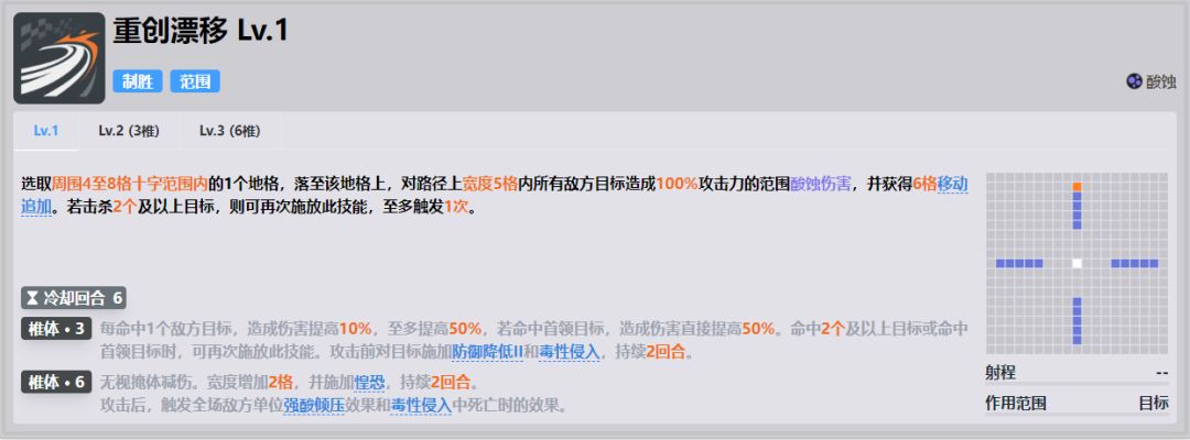 ●快速叠加强酸倾压的重要手段,是非常针对的,在面对召唤小怪的boss比如新歧路boss时性价比超级高,但是其他情况性价比比较低。●推图中则是用于增加自己aoe伤害能力的一种手段不过最好是造成击杀,这个固键只能作为一个保底●满椎之后加快强酸倾压的叠层速度