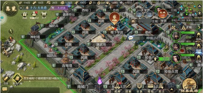 重点关注三个建筑:都府、演武场与稷下学宫。都府都有些什么功能,每种功能都有什么用;演武场提供的天赋有什么,我当前需要哪些天赋(前期一般是防御天赋);稷下学宫能招募到的名士有哪些,根据我现在的城市发展我需要什么名士等等。