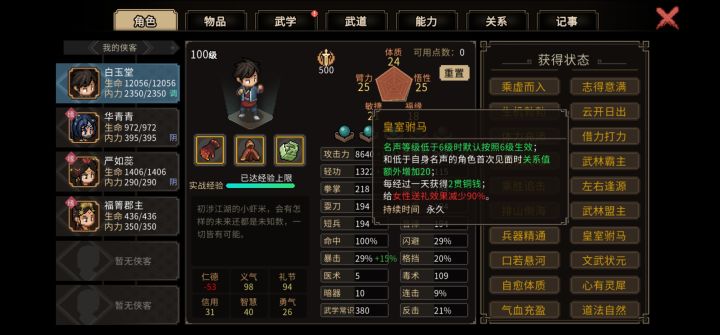 首先我们需要这个结缘郡主后拿到的皇室驸马,看起来这是一个debuff,实际上非常有用处,每次送礼时都会涨口才经验,礼物品质越好经验涨得越多,有了这个debuff可以让女npc吃下原来十倍的礼物。然后我们去找女npc们送东西,一个金色礼物涨400多口才经验,一个紫色的涨100多,不过还是蓝色的礼物升级效率快,一个女npc能让我们涨一千几的口才经验