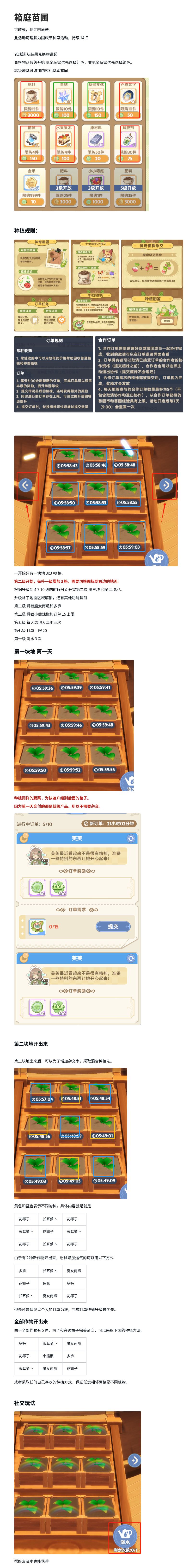 若昨天 X2 作物起床刚好收成若昨天 X3 作物可透过浇水快速收成若第一天顺利此时可以两区 9 + 9分别种植两种作物可开始接二级作物单或者只接一级作物单并且只种植一级作物这里按照个人喜好即可五级可帮人浇水两次先接合作订单再决定种植作物欠单请先与对方沟通商量何时交货个人订单请交最低质量合作订单请交最高质量意思是个人订单解最低需求例如只交蓝色就不交紫色合作订单则需求蓝色或紫色但主动交更多紫色或金色增加双方获得经验量快速升等第二天可六级苗圃
