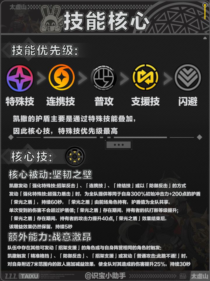 特殊技>连携技>普攻>支援技>闪避,凯撒的护盾主要是通过特殊技能叠加,因此核心技,特殊技优先级最高