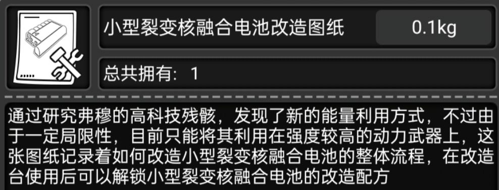作用一:可在加斯特处鉴定出小型裂变核融合电池改造图纸(动力锤锤柄改造后可装配件)