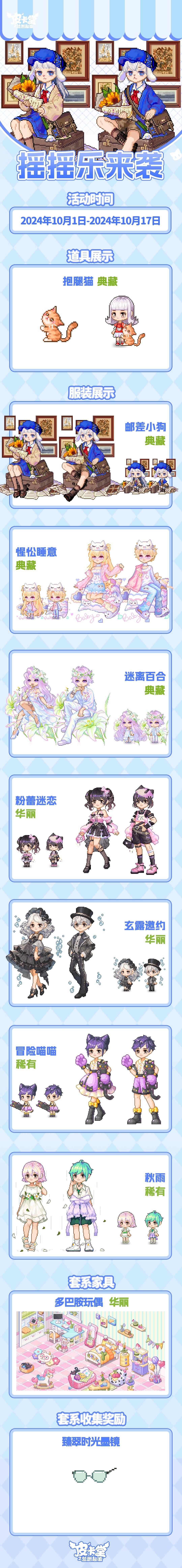 -【摇摇乐】 全新上线!参与可获得典藏套装「邮差小狗」、典藏套装「惺忪睡意」、典藏套装「迷离百合」、 典藏配饰「抱腿猫」、华丽套装「粉蕾迷恋」、华丽套装「玄露邀约」、稀有套装「冒险喵喵」、稀有套装「秋雨」,套系家具「多巴胺玩偶」!