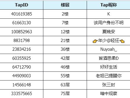 2.出游盖楼抽奖会在活动结束后的3个工作日内在本帖进行获奖名单的公布,届时需中奖玩家凭借游戏ID、获奖评论截图以及Tap主页信息寻找微信客服领奖哦~