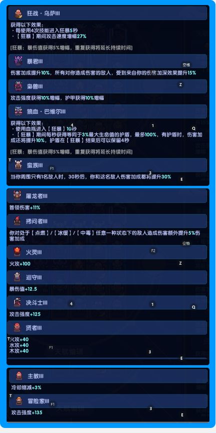 ③天赋:狂暴效果(5%爆伤增幅)、蛮族(30%全伤)