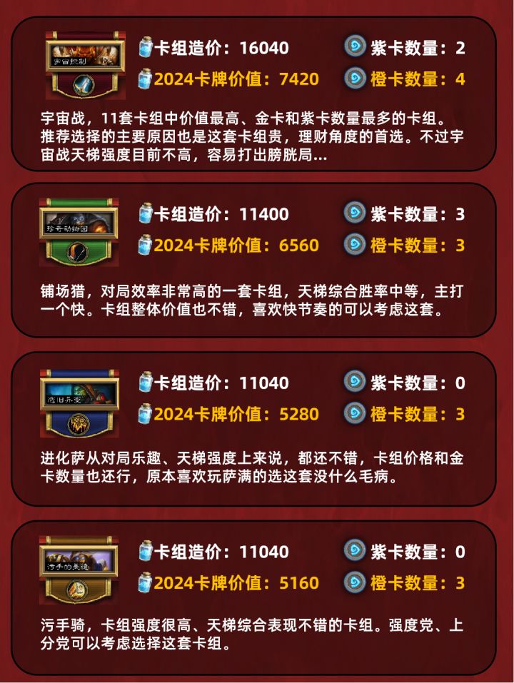 国服重开,除了送2023年全年金卡外,还可以直接获取1整套卡组,附赠的整套卡组需要在11套种选择1套,整理一下11套卡组的价格、强度等,给大家一些选择参考吧~